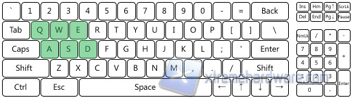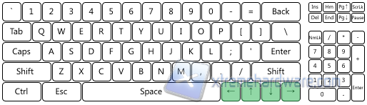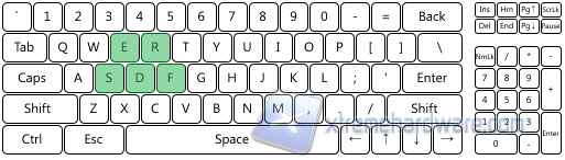 Con la combinazione (INS[6]) è invece possibile passare alla modalità 6KRO, che limita l'antighosting a 6 tasti massimi. In questo caso vediamo alcuni esempi di possibili combinazioni, ma come al solito è possibile premere tasti (fino ad un massimo di 6) in qualunque area della tastiera.