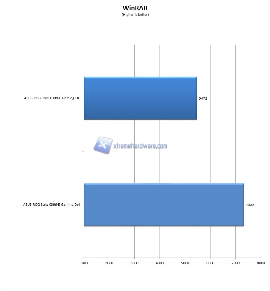 WinRAR, famoso software di compressione e decompressione di archivi di dati. Al suo interno è presente una utility di benchmark che comprime un file standard atto a tale scopo; il software provvede a restituire il valore di compressione espresso in KB/s. Il grafico rispecchia la tendenza del software a beneficiare maggiormente della frequenza di lavoro delle memorie.